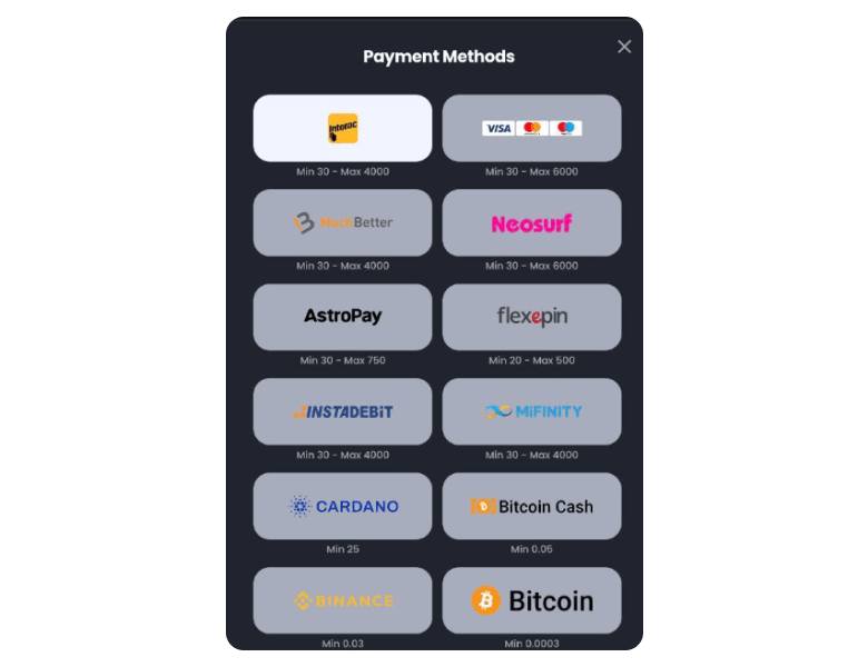 First off, let me say I liked the overall design of the Bitkingz bonus program. It has a little something for every type of player, including new, loyal, and crypto users. It also gives you the option to bypass the high 45x play-through requirement by making a larger deposit, as is the case with the C$150 re-triggerable offer with 0x requirement and a C$75 minimum deposit requirement. Either way, I had to first play with the welcome package, which was C$7,500 and 500 free chips. I triggered it with three fiat deposits, as cryptocurrencies were not supported.