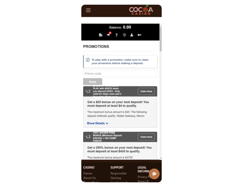 Claiming your Cocoa Casino new player bonus is quick and doesn’t require any bonus codes. Here’s how I did it: