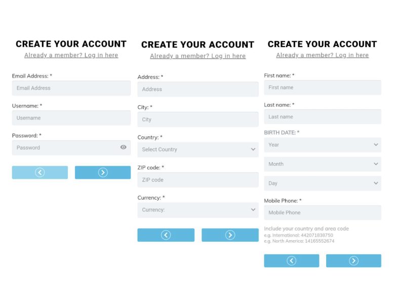 Fill out the required fields, including your email address, username, and password. Then, provide more details like address, preferred currency, full name, and birth date. Double-check your details and tap the arrow button to proceed.