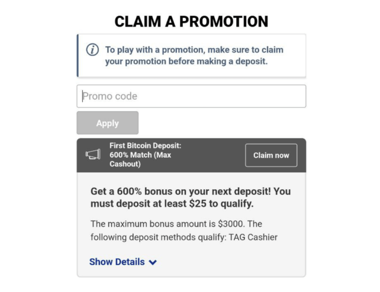 Open the menu and select “Promotions” to view all available bonus offers. Here, you’ll confirm the bonus you selected earlier. Some offers require a bonus codes. Enter the code in the promo code field and click “Apply” to activate your bonus.