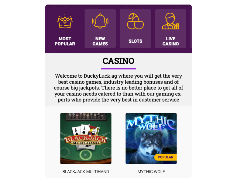 DuckyLuck Casino delivers a range of bonuses designed to attract both new and loyal players. The 500% Welcome Bonus, capped at $2,500, includes 150 Free Spins, making it a notable starter offer. However, it comes with a 30x wagering requirement, which may require some commitment. For returning players, the DuckyBucks Loyalty Program introduces tier-based rewards like daily cashback and match bonuses up to 380%, with progress tied to regular deposits. Crypto players are also catered to with a 600% deposit match bonus, adding flexibility to payment options.