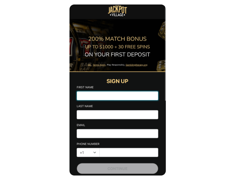 After selecting the bonus on our website, you'll be redirected to the Jackpot Village’s official page. Once there, click the “sign up” button to create an account.