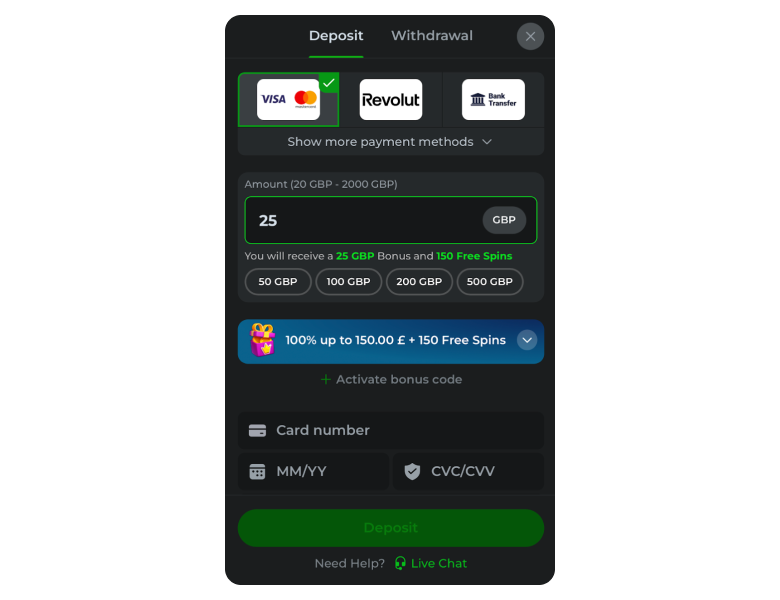 Claiming the welcome bonus at Jackpotraider was smooth and doesn’t require a learning curve for first time users. After signing up within 5 minutes and making the first deposit of £150, I got an extra £150 with 150 free spins. My new total balance was a great start, but I needed to play through the bonus amount 35 times within 7 days, which was a little stiff.