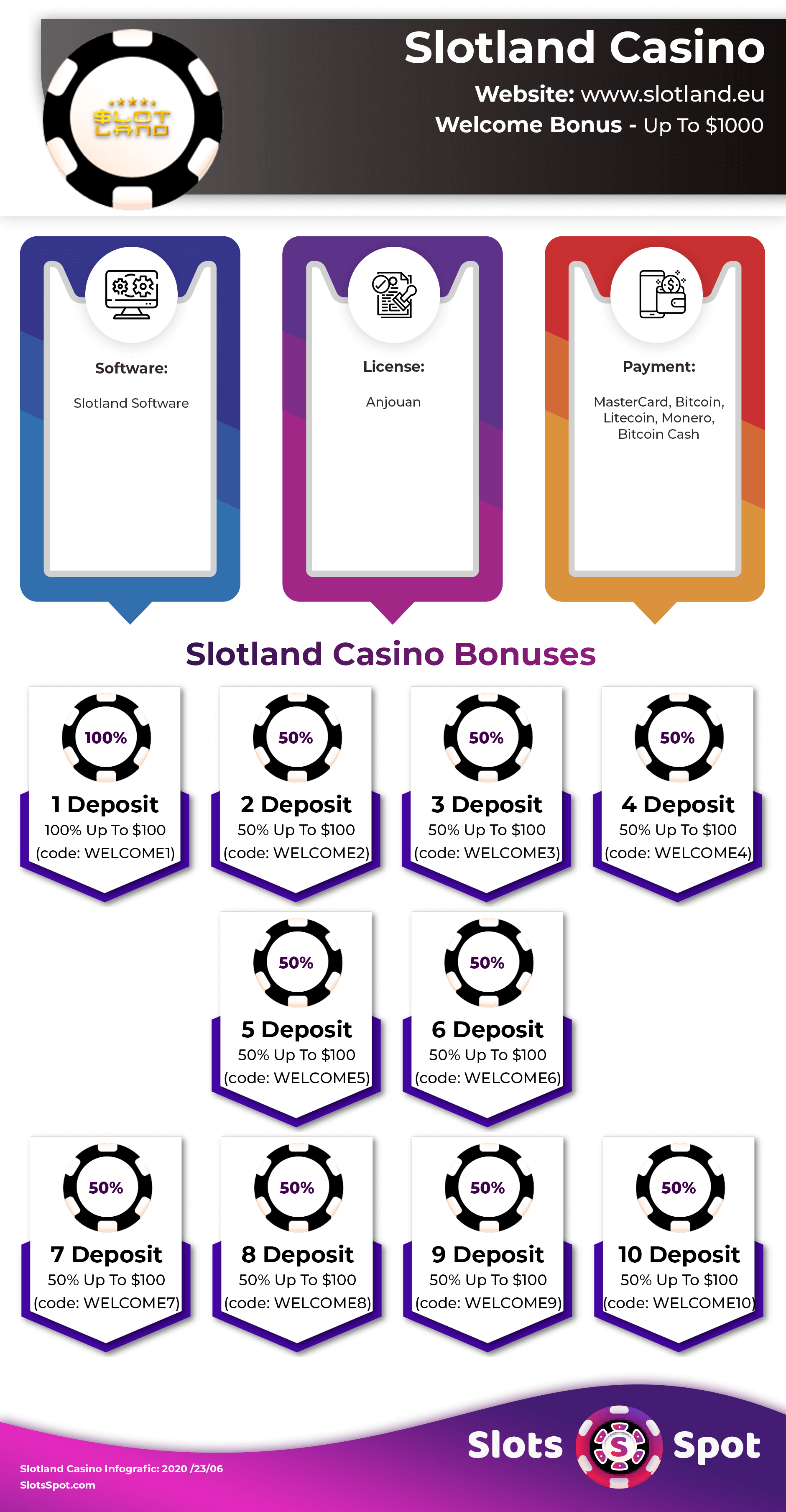 It’s not hard to see why players choose the Slotland Casino Bonuses, instead of other ones. These guys know, how to make things right and make the gaming process funnier and much more interesting than it has ever been. The user doesn’t have to waste time – its worth to start the game right now.