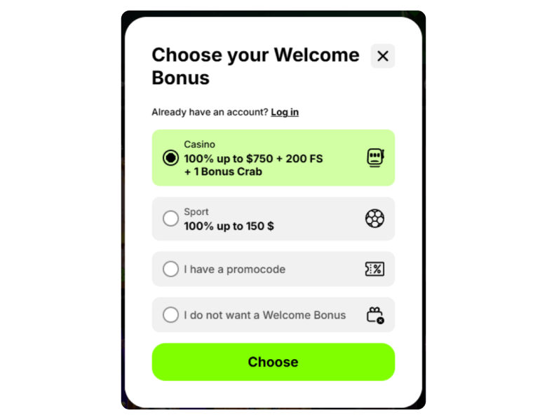You’ll be prompted to choose between the casino and sportsbook bonus. Select the casino welcome bonus, it’s the one that includes the match offer and free spins.