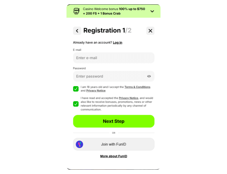 Start by clicking the Claim Bonus button on our site. It takes you straight to the SpinIt website with the full offer in view: 100% up to C$750, 200 free spins, and a Bonus Crab pick.