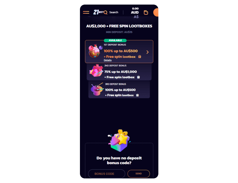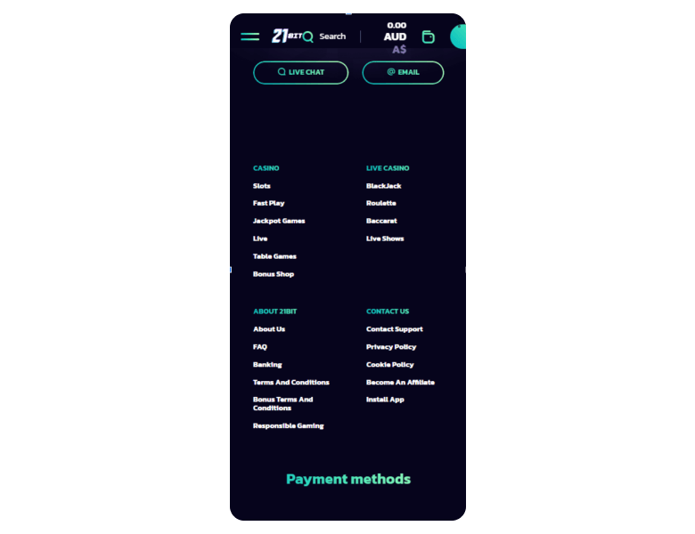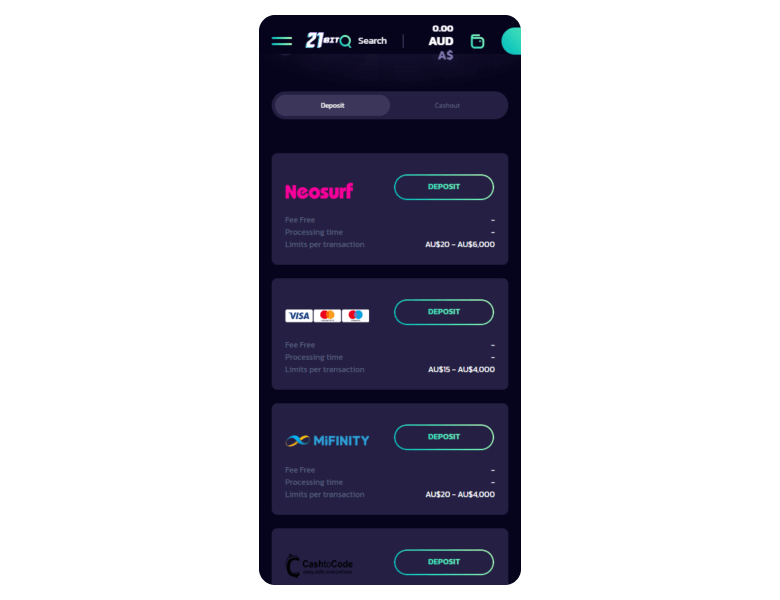 At the 21bit casino you can fund an account with fiat or crypto. As for me, I prefer BTC. Today, there are gateways for financial transactions, such as Neteller, Skrill, Visa, Mastercard, Bank Transfer, BTC, LTC, and some others. For now, the minimum deposit sum is only C$15.