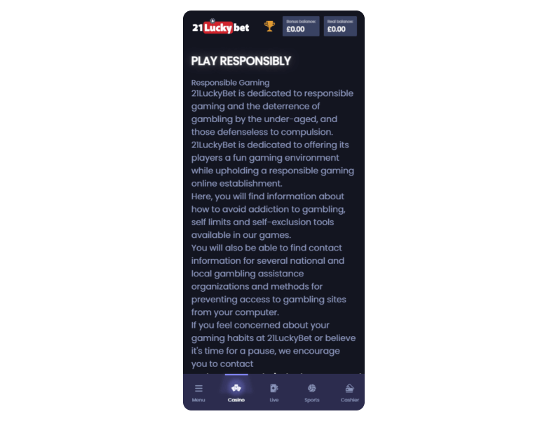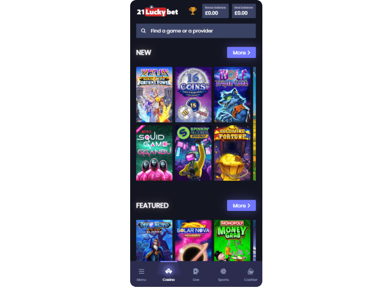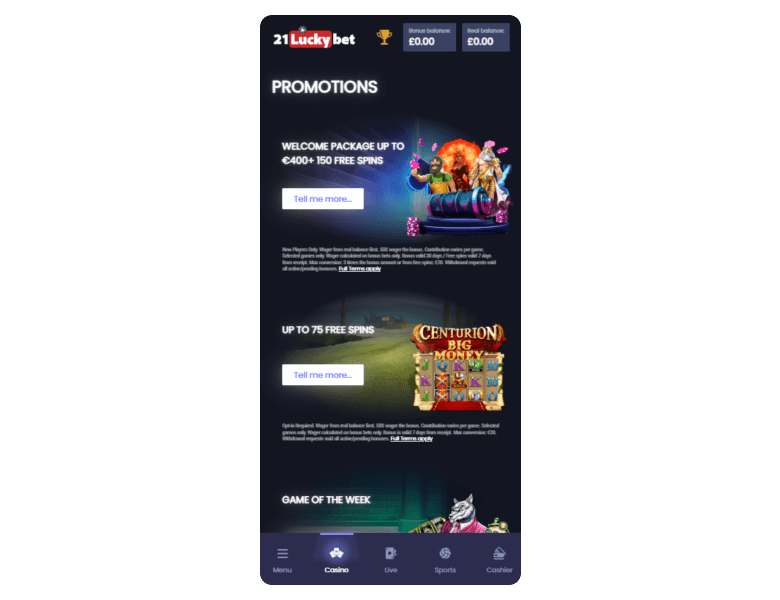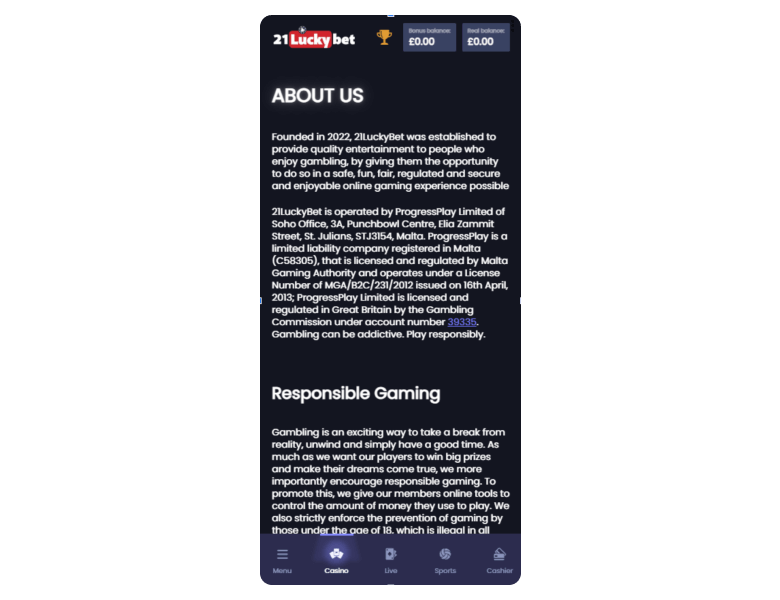 Screenshot of the main sections of the casino website: