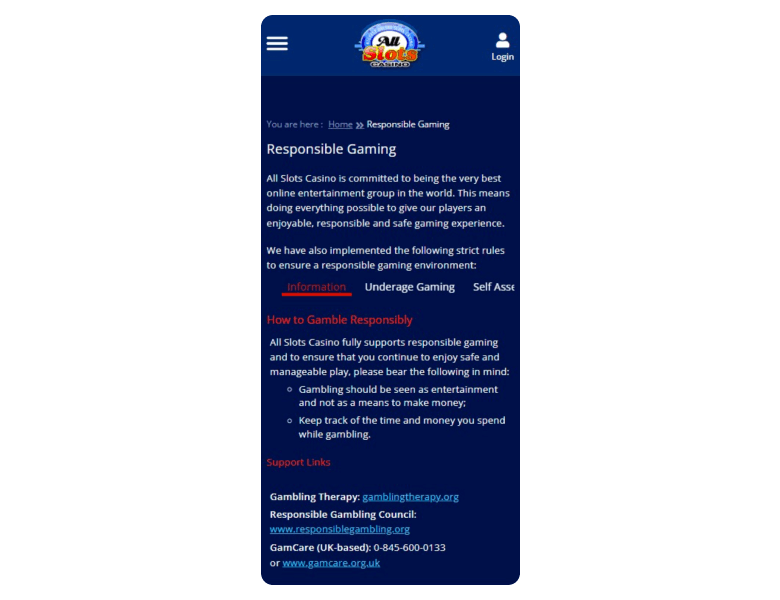 The platform covers the key responsible play basics, which are financial limits you can set, self-exclusion/cooling-off breaks you can take, or tests with questions to check your gambling behavior. Clickable links to support groups/agencies like Gambling Therapy are in place. I was mostly satisfied with the set of tools All Slots offers. I guess I’d just add a reality check for more control. Sometimes, when the game is so good, you can lose track of time, and that tool helps you not to.
