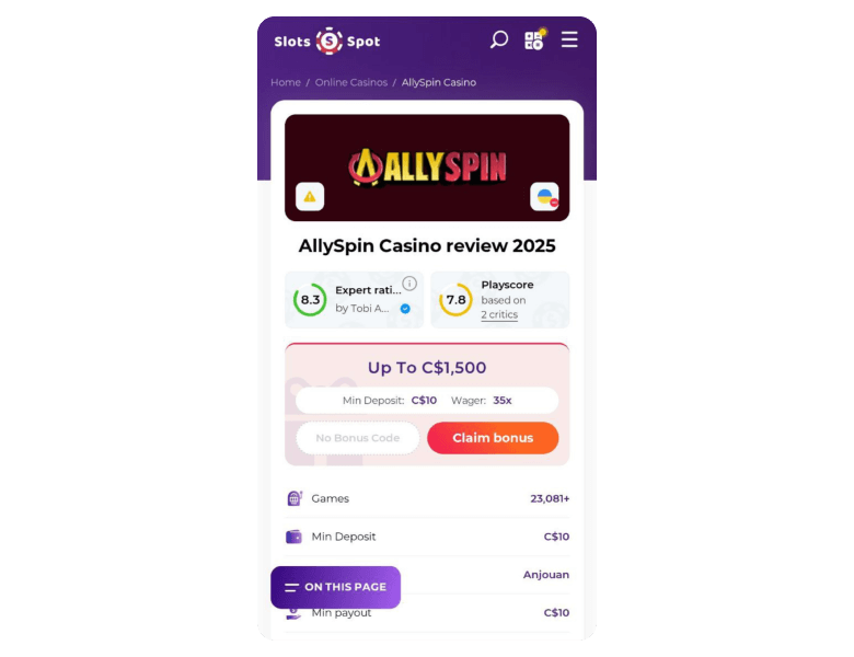 Review Disclosure: This review is based on my experience playing at AllySpin Casino and testing its games, payments, bonuses, and features.