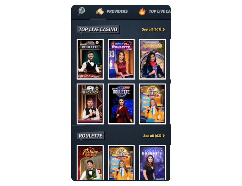 | Live casino providers | Evolution Gaming, Pragmatic Play Live, Ezugi |