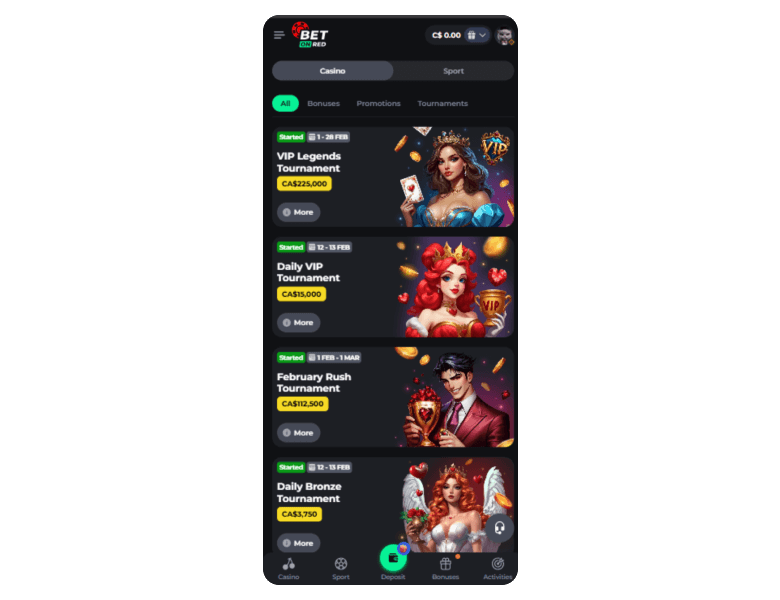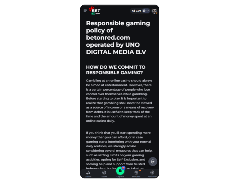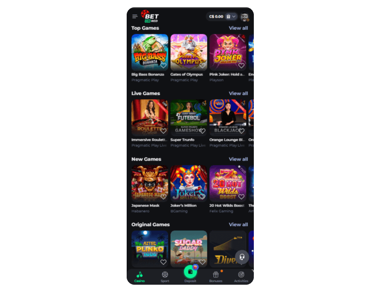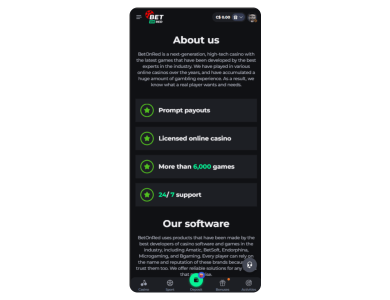 The online casino was launched in 2022 and operates legally, which, as I checked, is confirmed by the current license of the Curacao Commission. Among other things, I was impressed with the BetOnRed bonus program. New customers receive up to C$675 + 250 Free Spins from the operator after the first deposit.