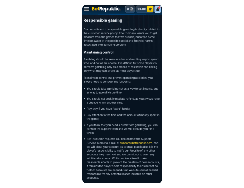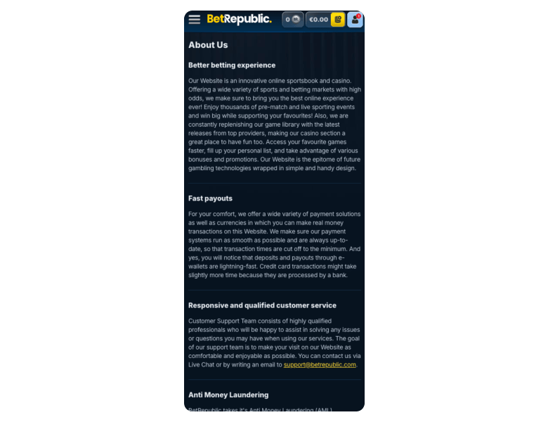 BetRepublic offers 24/7 live chat and email support, plus a well-structured Help Centre where you can find basically all the details you may need concerning payments, verification, technical issues, and bonuses.