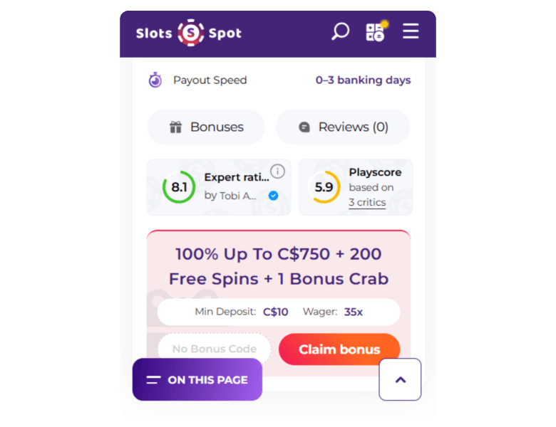 100% Up To C$750 + 200 Free Spins + 1 Bonus Crab | C$15 | 35x | No Code Required | |