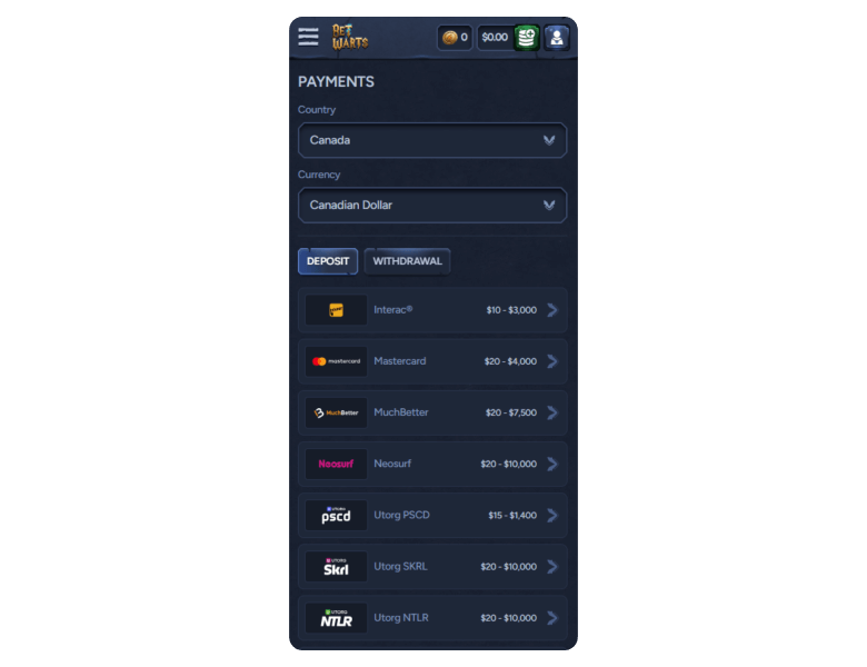 When you visit the deposit section at the cashier, you’d be able to choose from a range of local or crypto deposit methods, including Jeton, Interac, USDT, and Litecoin: