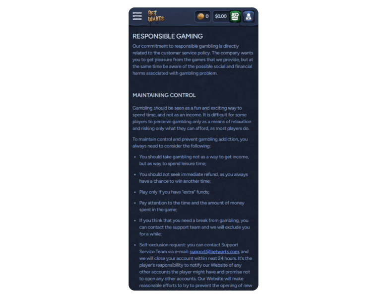 Customer support at Betwarts is available via email at support@betwarts.com and live chat 24/7. You won’t have to wait longer than 5 minutes to get a response via chat, but email takes a few hours, depending on the pending requests the team is handling.