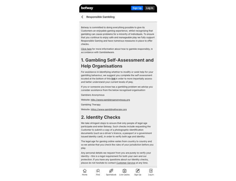 As I noticed, Betway Casino's responsible gaming tools include deposit limits, cooling-off periods, and voluntary self-exclusion for at least 6 months if needed. I like that the site promotes safer play, provides a reality check option, and links to external support services such as GambleAware for professional help. Who knows when it can come in hand.