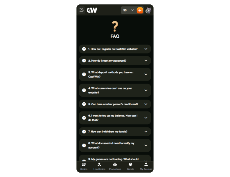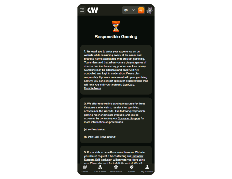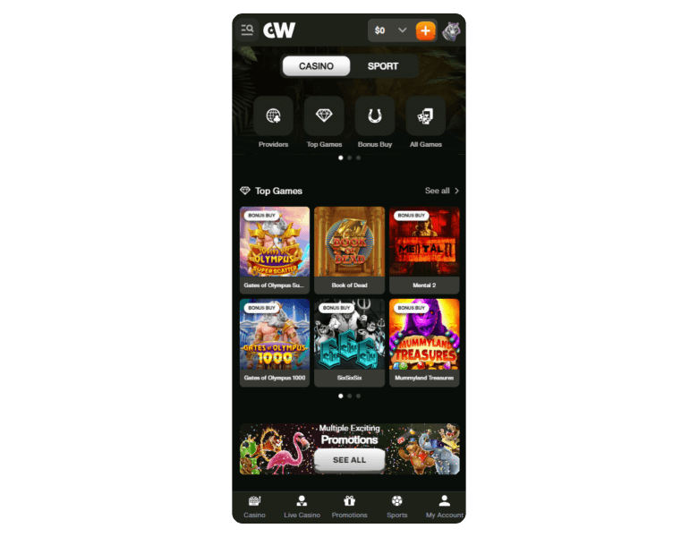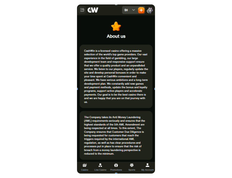 Screenshot of the main sections of the casino website:
