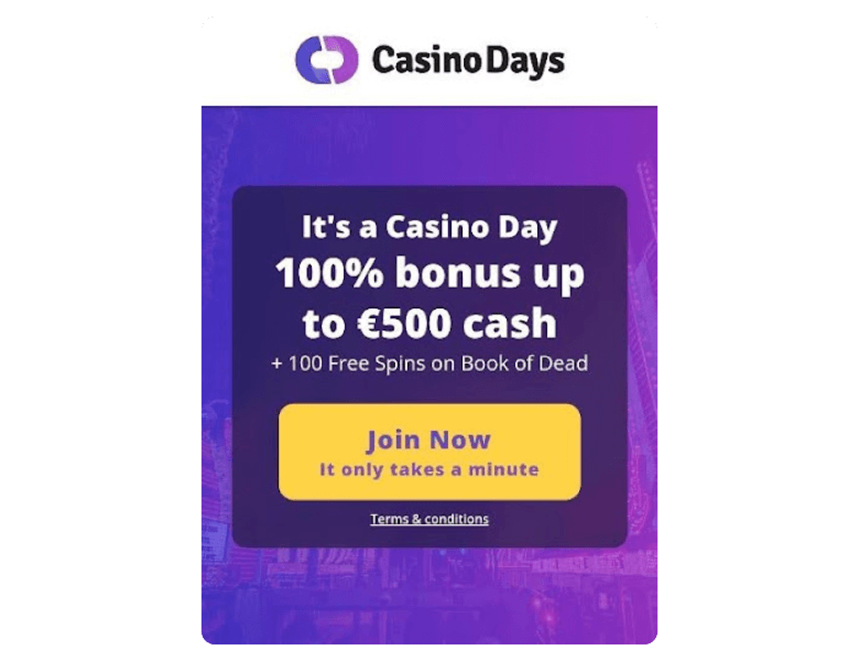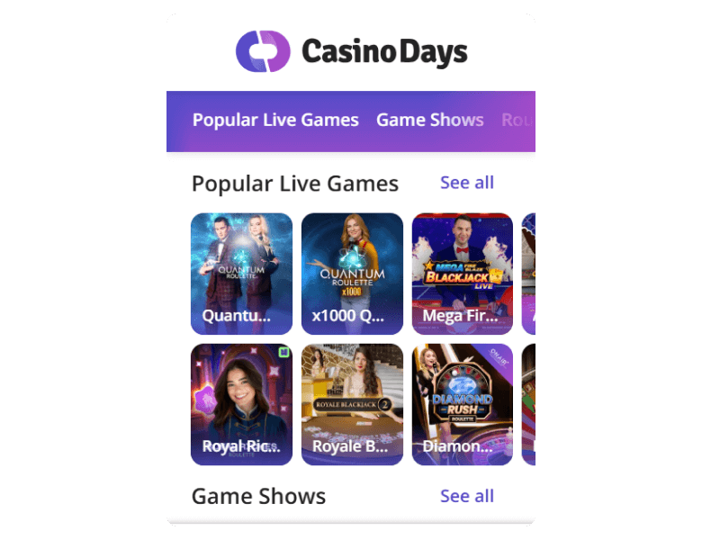 Casino Days has more than 6,500 games, including table games, slots, and live casino games. Games from more than 40 providers are available on the site.