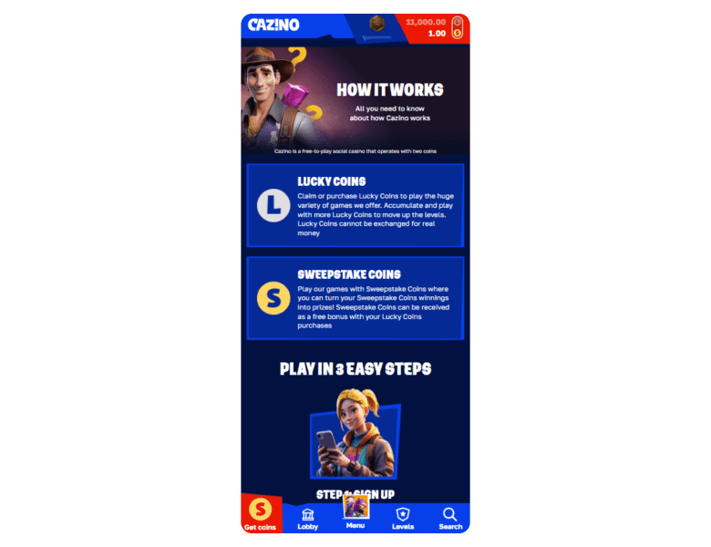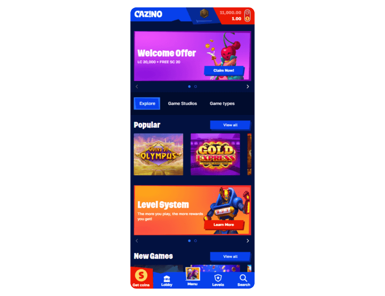 Like all sweepstakes sites, Cazino uses a dual-coin model: Gold Coins (GC) and Sweepstakes Coins (SC). Gold Coins are for casual play and can be received through free offers, daily logins, or by purchasing coin packages. Sweepstakes Coins, however, cannot be bought. You can only receive SC as a bonus with certain Gold Coin packages or through no-purchase offers like profile completion and email rewards.