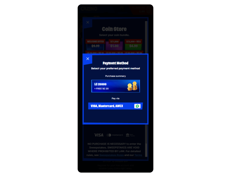 Players can redeem SC for cash prizes using Visa, Mastercard, Amex, or a standard bank transfer.