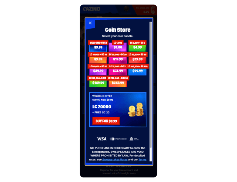 Even though purchases are optional, Cazino lets you purchase Gold Coins using familiar methods. These methods also work for coin redemptions.