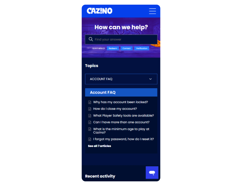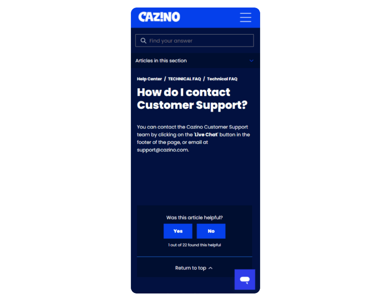 I tested Cazino’s support myself using live chat and email. Live chat responded within a minute, and the answers were clear and helpful. There’s also a contact form and 24/7 service for anything urgent.