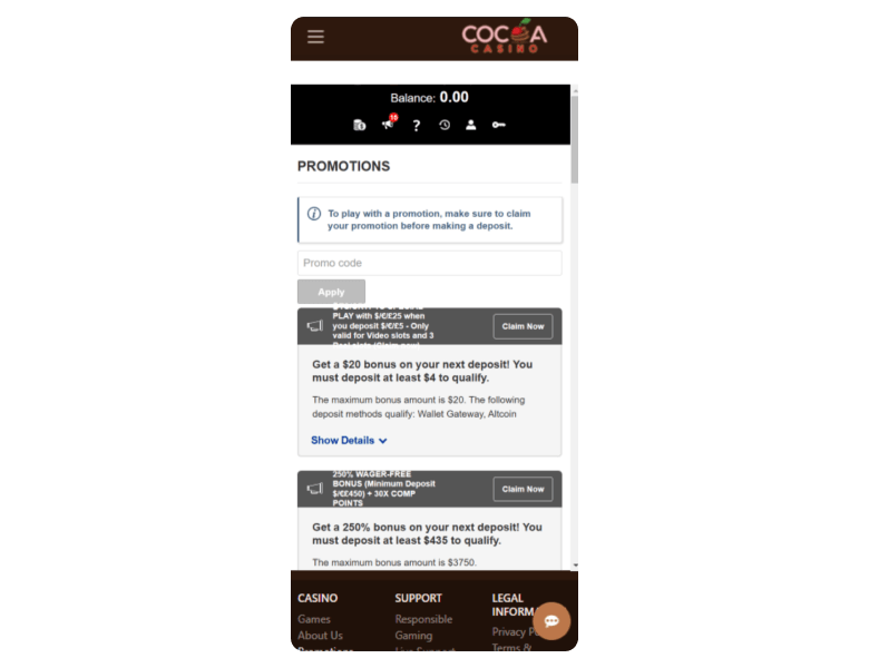 There’s no mobile casino app for Cocoa Casino, but the browser version runs fine on Android and iOS. The layout is stripped down, with fewer graphics, faster loads, and no bugs during gameplay.