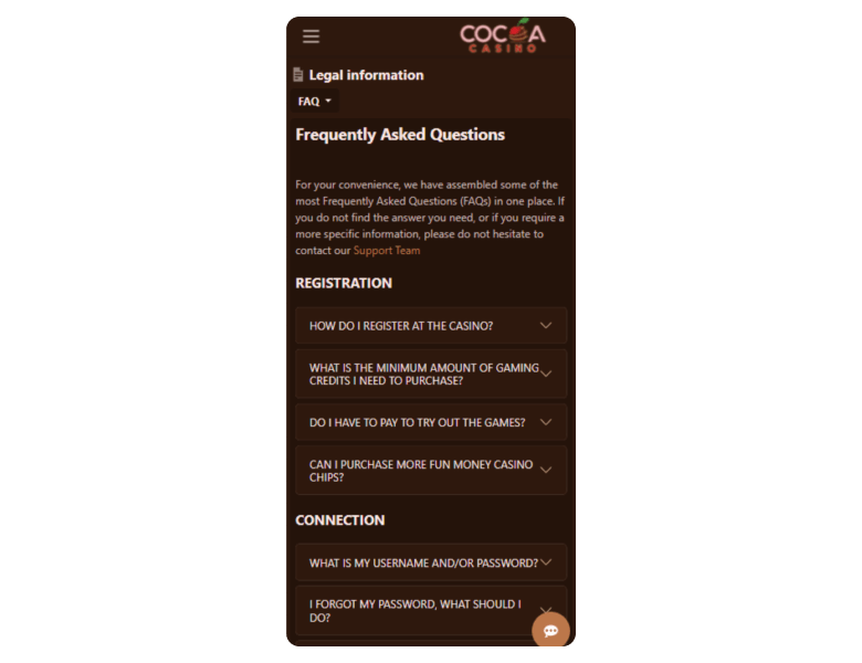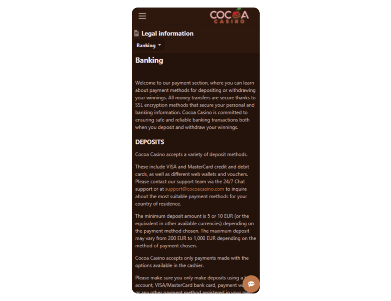Compared to customer support on sites like Energy or Grande Vegas Casino, Cocoa’s support team holds up fine. Its FAQ section is not overly detailed or layered, but it works, especially if all you need is help with bonuses, payments, or verification.