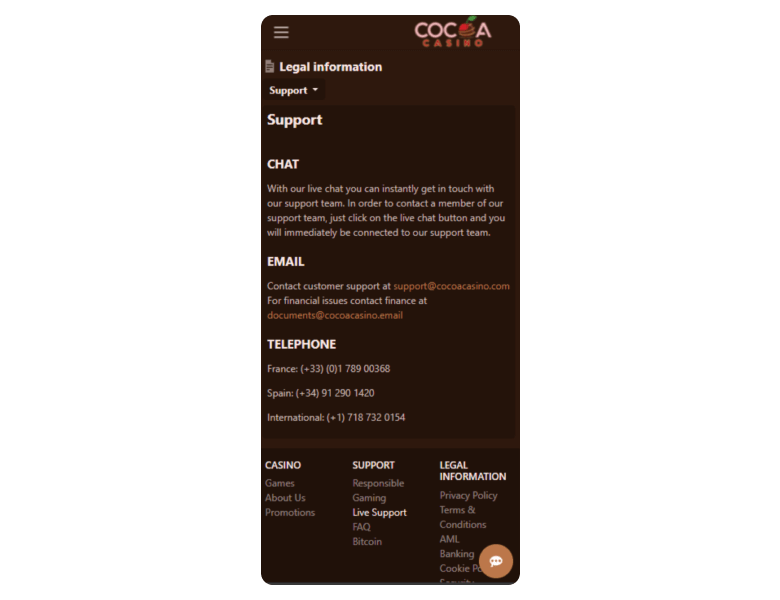 Cocoa Casino offers 24/7 support via live chat, email support@cocoacasino.com, and telephone on: