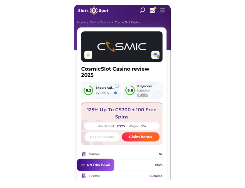 Review Disclosure: Based on a careful analysis of CosmicSlot Casino's games, bonuses, and features, this is my honest review of the site.