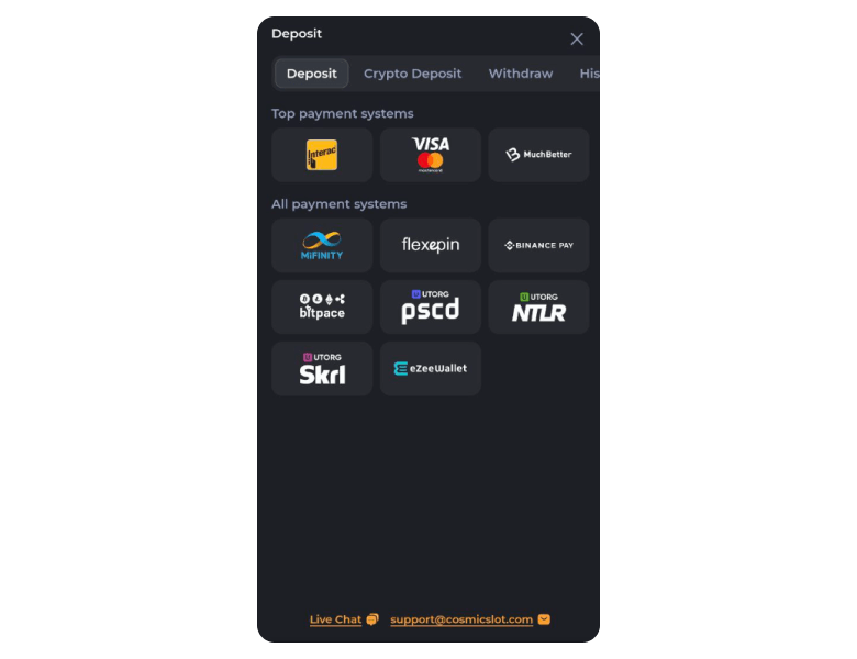 CosmicSlot Casino supports deposits via numerous options such as e-wallets, credit cards, online banking, and cryptocurrency.