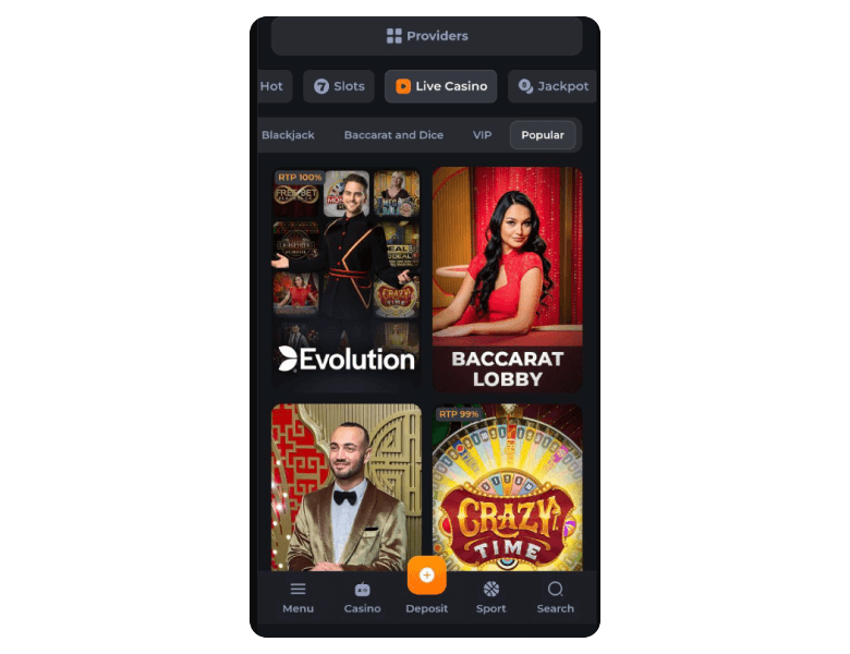 You can find winning opportunities in Roulette, Blackjack, Baccarat, Poker, and various game shows. Get an overall glimpse of the live casino options below.