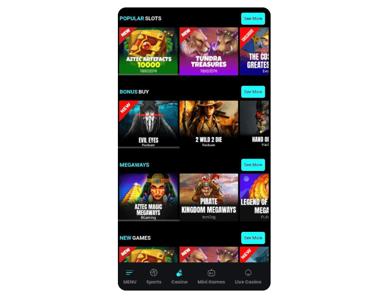 CosmoBet offers a wide range of games, so everyone can find something they like. The games are grouped into categories like Online Slots, Live Casino, and Table games. This collection is powered by the casino’s collaboration with over 90+ software providers.
