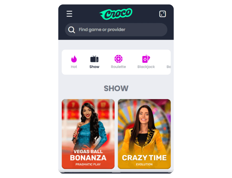 All the games I expected to see in Crocoslots live dealer section were present. I could just scroll or type in roulette, blackjack, baccarat, or game shows to find them. Providers like Evolution Gaming and Pragmatic Live own the tables in this section.