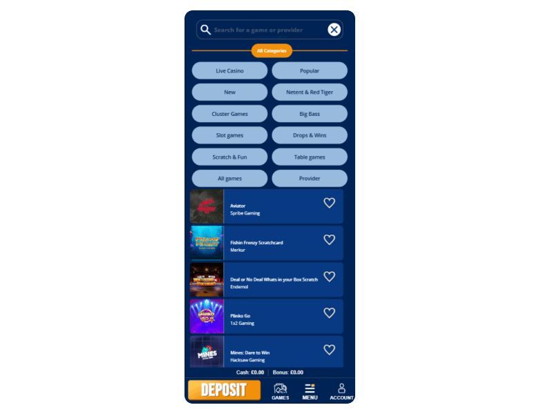 Screenshot of the main sections of the casino website: