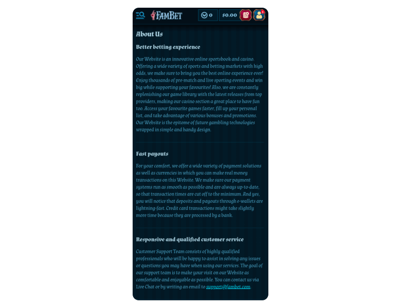 Getting in touch with the FamBet support team is easy through live chat and email. However, the live chat option provided the best assistance in 2 seconds. There’s no bot interference, which means you get to converse with a human right away.