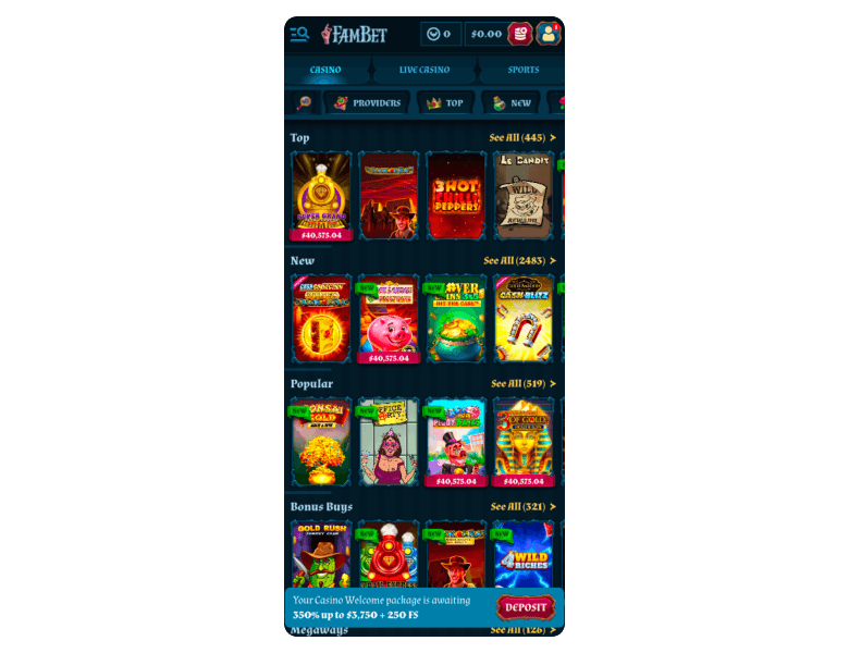 I found a total of 9,100+ casino games on FamBet, including 8,658 slots, 281 live dealers, and 161 table games. You can sort games by name, genre, provider, and even popularity with the site’s filters.