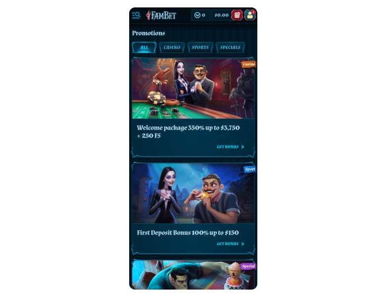 Anyone who’s watched “The Addams Family” can tell that it inspired FamBet’s design. That dark theme drew me in with the option to choose one of two welcome bonuses as the first step to signing up. I’d say the registration process is pretty standard, and the site is not difficult to get around.