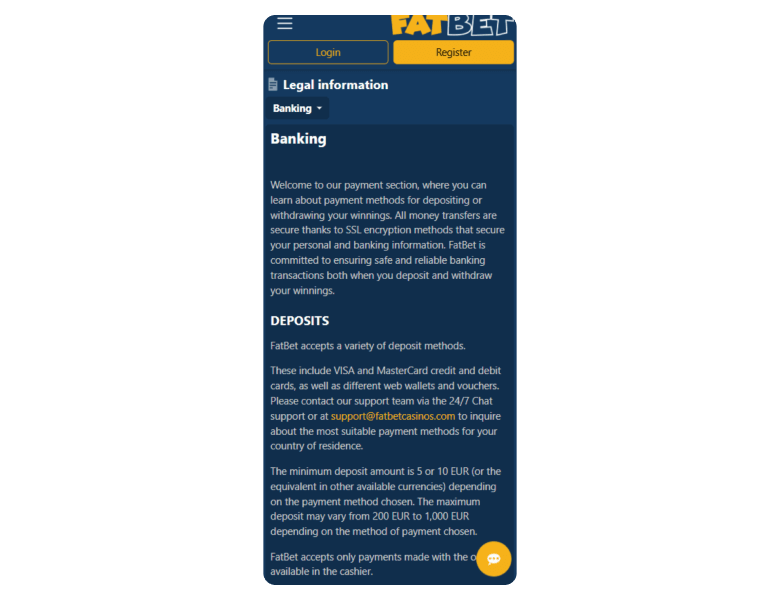 Fatbet has a 24/7 customer support service. They support three channels of communication. You can use email and telephone without having to log in. For live chat, you need to be logged in to your account.