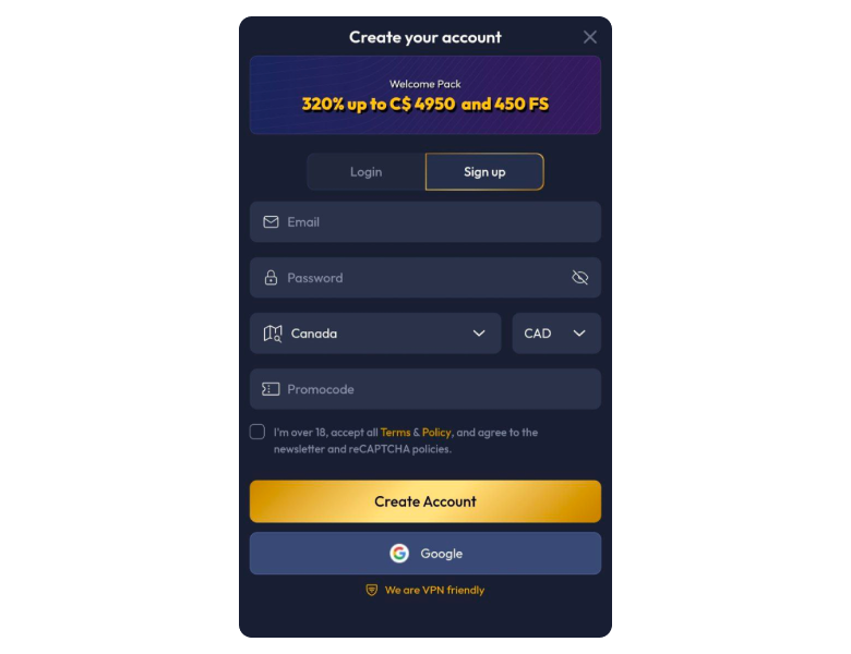 320% up to C$4,950 + 450 Free Spins | C$35 | 45x | No Code Required | |