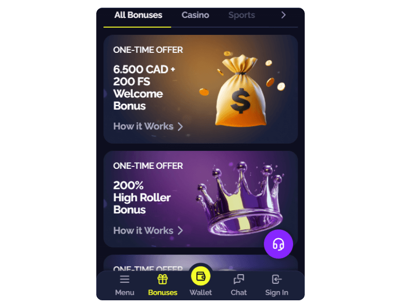 | Welcome Bonus | 550% up to C$6,500 + 200 Free Spins | C$20 | 45x | Not Required |