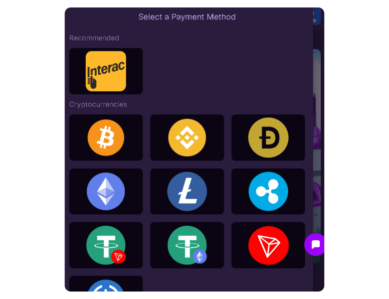 HitMe accepts cryptocurrencies like Bitcoin. Binance, Doge, Litecoin, and USDT. Fiat transactions are limited to Interac. Let’s see which ones you can use for deposits and withdrawals.