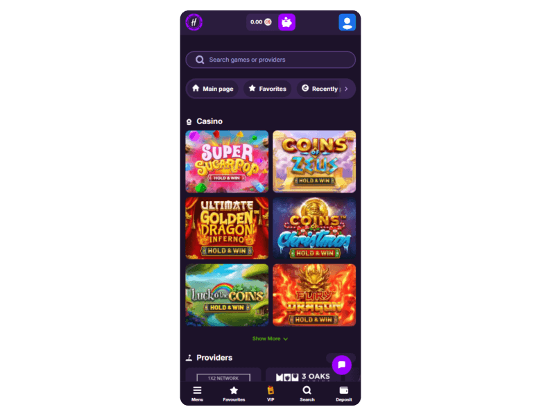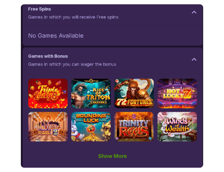 HitMe delivers over 6,800 games, including slots, live tables, crash games, shows, and poker. Virtual sports betting opportunities are also available on the site. Besides the games, HitMe delivers a good bonus package with a unique no-max cashout policy.