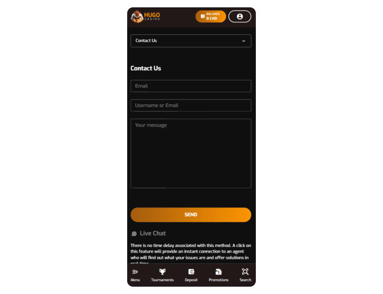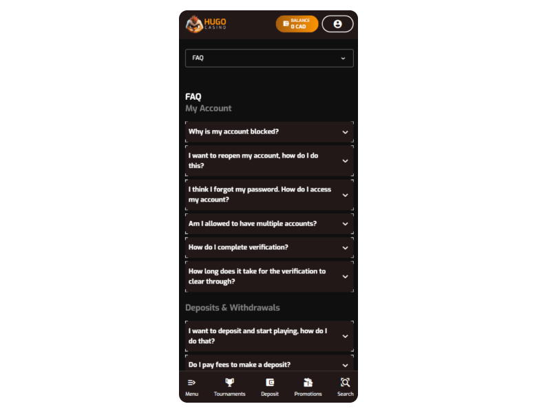 If you encounter challenges on Hugo Casino, you can reach the support team via email and live chat. But if you're just curious about basic things, the FAQ page offers answers to some popular questions.