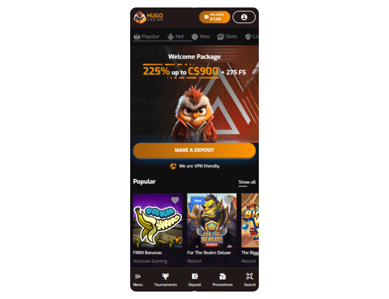Hugo Cashback | Up to 10% weekly VIP tier-based offer | C$75 | 30x | Not Required |