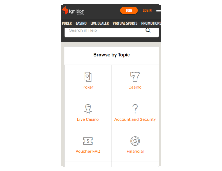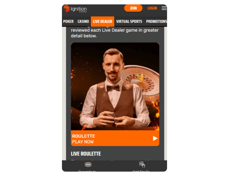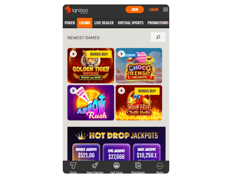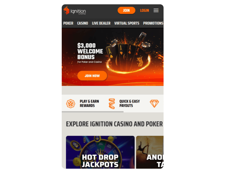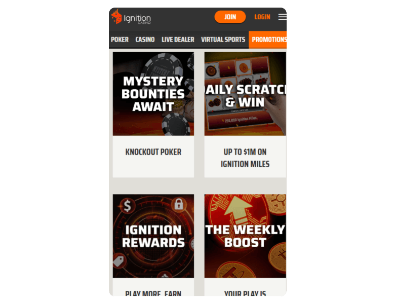 In this review, we would like to take a closer look at what Ignition Casino has to offer Aussie and American players. To make sure that we won’t miss any element of the casino, we started with the Ignition main page. It includes several sections that help to navigate through content. In the Ignition Casino’s header, you can see a logo of the site and a horizontal navigation bar with such sections as Poker, Casino, Live Dealer, Virtual Sports, Promotions. Before you start playing games from the Ignition collection, you need to register an account clicking on the ‘Join’ button at the top.