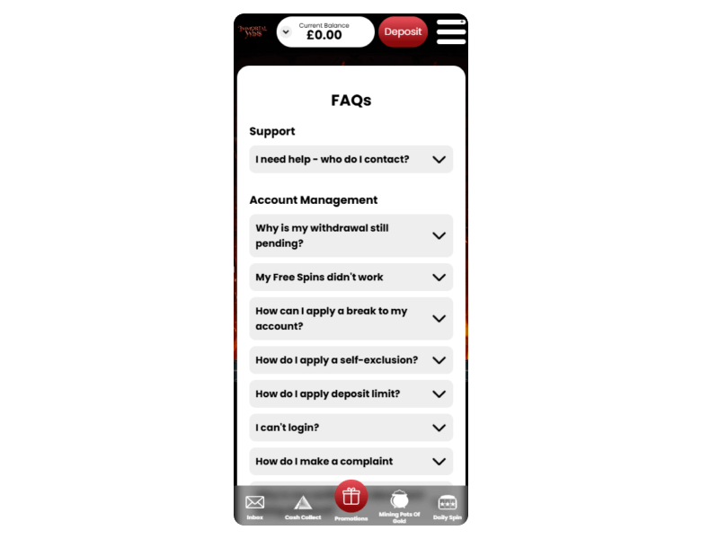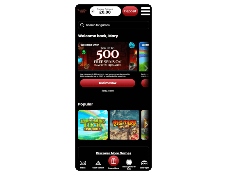 Screenshot of the main sections of the casino website:
