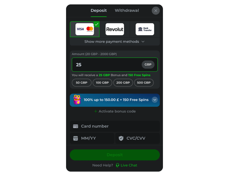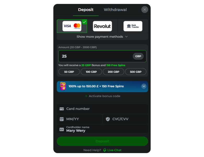 The limits are low at £38 - £2,000 for withdrawals, but it makes sense from the AML and responsible gambling standpoint. Plus, excluding the casino’s processing time, which doesn’t exceed 24 hours, your withdrawals are settled in a day or less.