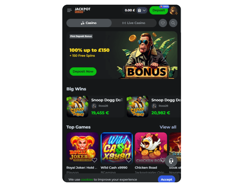 Jackpotraider has been getting some attention from crypto casino gamblers in the UK, so I registered to check it out. My first impression of the aesthetic is that the operator prioritized a clean and basic interface to accommodate players of all experience levels.
